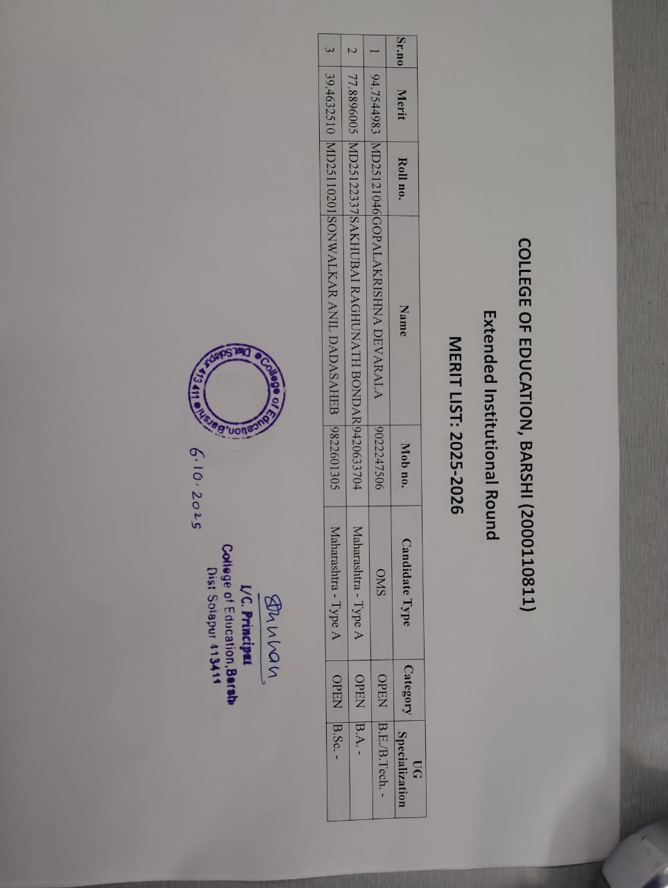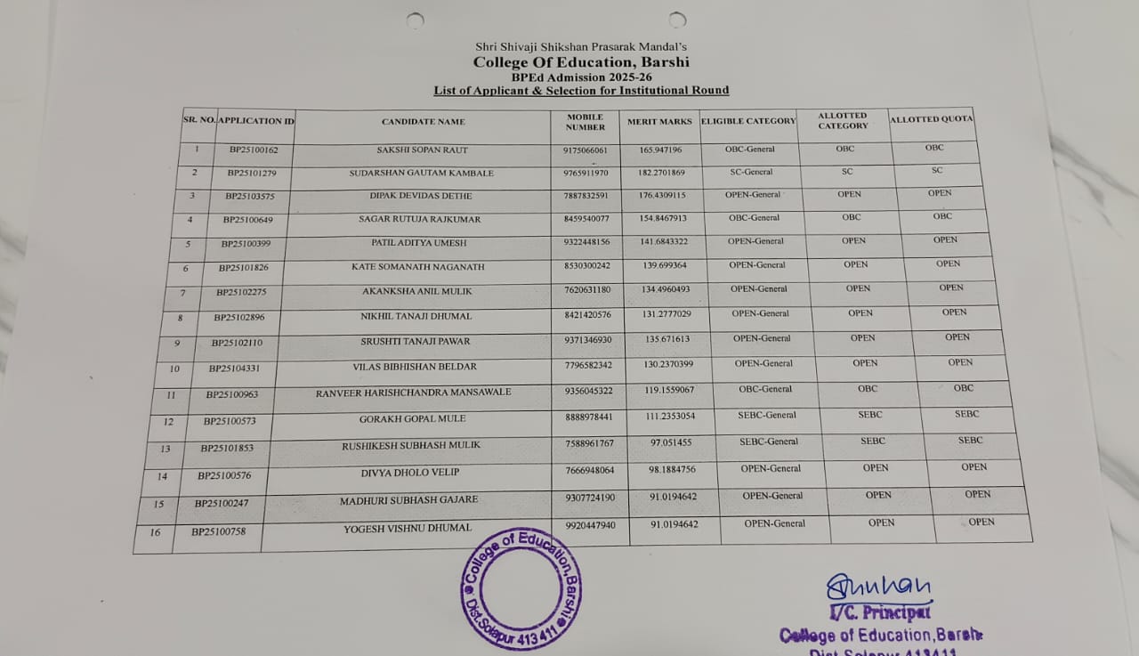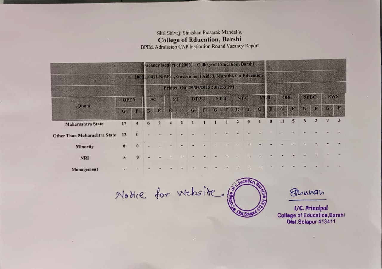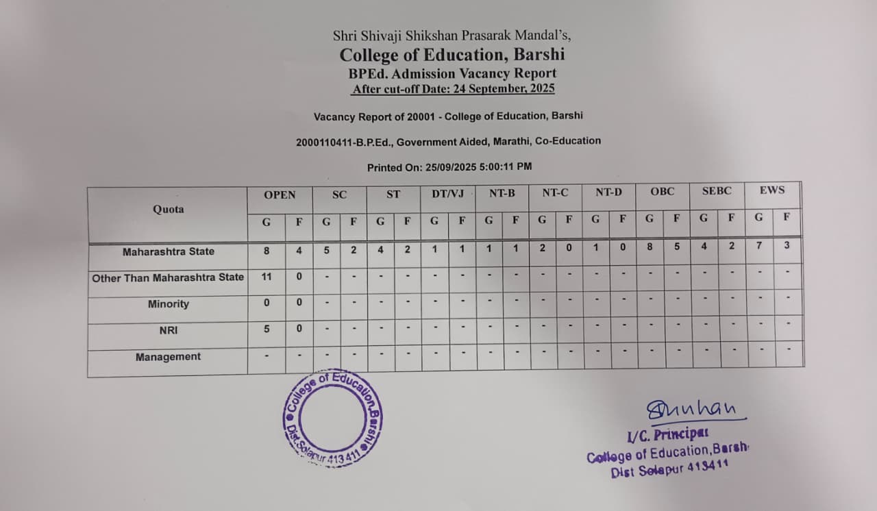 B. P. Ed Institutional Round IV Vacancy Report & Merit List 2025-26 Click Here |