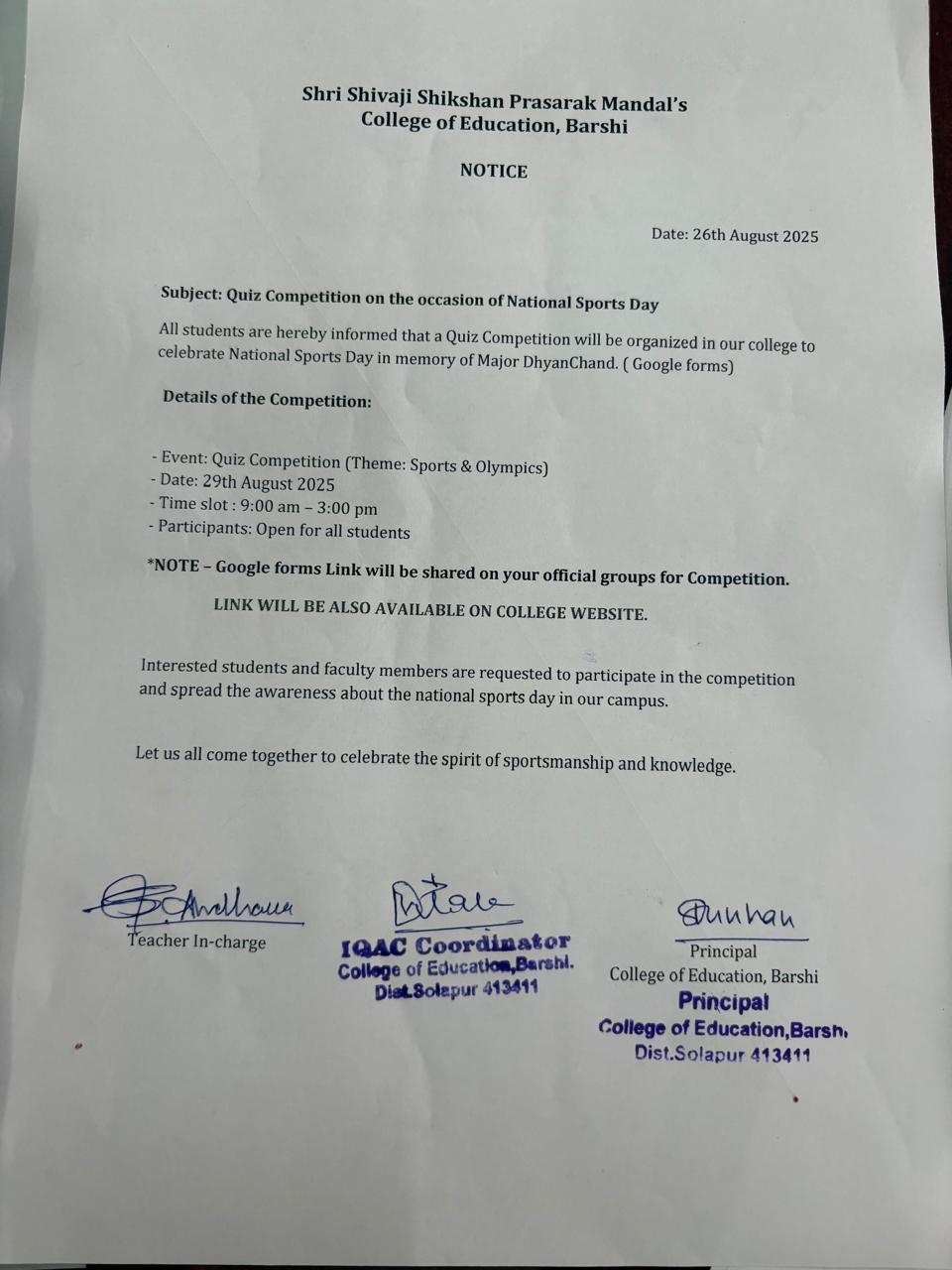 Quiz Competition on the occasion of National Sports Day Click Here For Entry Form Click Here |